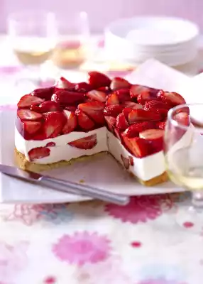 Mix 2 tablespoons strawberry syrup, 2 tablespoons water and 1 teaspoon liqueur and brush the cake base with it. Soak 4 leaves of gelatine in cold water. Mix yoghurt, lemon juice and vanillin sugar. Squeeze the gelatine and melt it in a small pot. Stir in 2 tbsp. yoghurt, then stir into the rest of the cream. Chill the cream for about 10 minutes until it starts to gel
