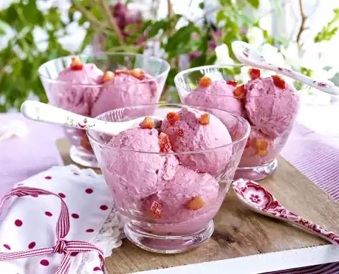 Before serving, wash the strawberries, dab dry, clean and dice them. Form yoghurt ice cream into balls, fill into glasses and decorate with strawberry cubes