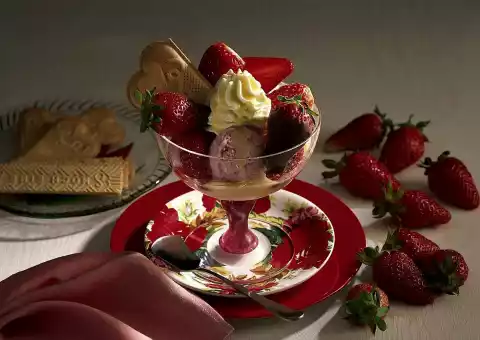 Form balls with an ice-cream scoop and arrange them in glasses. Decorate with cream, advocaat, chocolate strawberries and strawberries.