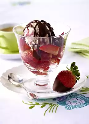 Allow ice to thaw a little before moulding. Wash the remaining strawberries and put 4 aside. Clean the rest and cut into small pieces. Mix with 2 tablespoons of sugar. Chop the chocolate and melt in a hot water bath. Dip the whole strawberries halfway into the chocolate and let them dry on baking paper.