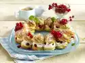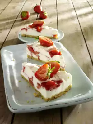 Carefully stir the cream again. Whip cream until stiff and fold into the cream. Spoon the cream and strawberry puree alternately into the mould and marble lightly with a spoon. Chill the cake for 4-5 hours. Cut 8 strawberries in half. Before serving, remove the cake from the edge and base and decorate with strawberry halves