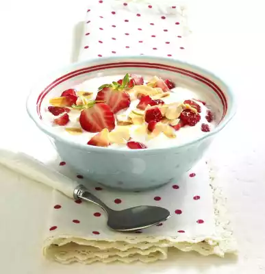 Roast the almonds in a pan without fat and take them out. Wash and clean the strawberries and cut them into small cubes. Mix yoghurt, sugar and strawberries and place in a bowl. Sprinkle with the roasted almonds