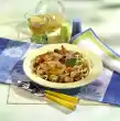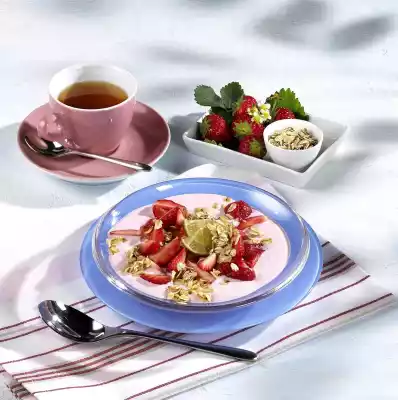 Fry the oat flakes in a pan without fat until golden brown. Take out and let it cool down. Wash, clean and slice the strawberries. Sprinkle with lime juice. Put strawberry yoghurt in a bowl.