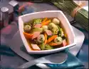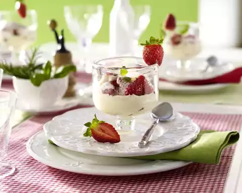 Whisk on a warm water bath (water must not boil!) for approx. 12 minutes with the whisk of the hand mixer until thick and creamy white. Spread the zabaglione evenly over the strawberries, decorate with strawberries and lemon balm set aside.
