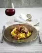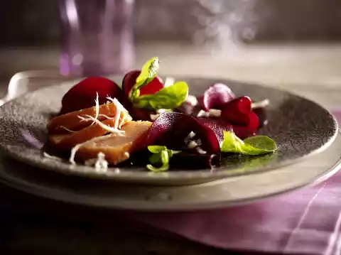 Remove from the pan and let it cool down. Wash and peel the horseradish and peel it with a julienne chaff. Clean and wash lamb's lettuce and drain well. Mix with the onion cubes into the beetroot. Cut salmon into 12 slices. Arrange salad and salmon sprinkled with horseradish