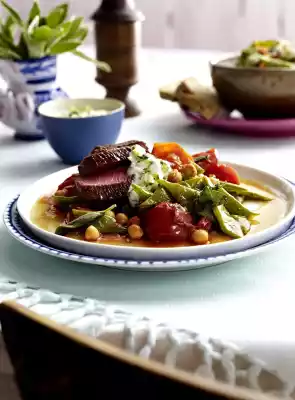 Add the beans with the cooking liquid to the tomato sauce, bring to the boil and simmer for 2-3 minutes. Season to taste with salt and pepper. Cut lamb salmon into slices and arrange on plates with the beans and tomato vegetables. Serve with tzatsiki and possibly some bread