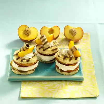Cut out 20 circles (8 cm Ø) from the sponge cake. Wash 3 peaches, halve, stone and cut into very thin slices (approx. 2 mm) (approx. 8 slices for a turret). For 10 sponge cake circles, place 3-4 columns on each side with the cocoa strips. Pour the cream into a piping bag with a star-shaped spout and squirt it onto the peach slices, leaving a little for decoration. Place peach slices on the cream again and finish with a sponge circle. Decorate the turrets with cream tuffs, wafer rolls and peach wedges and chill again if necessary.