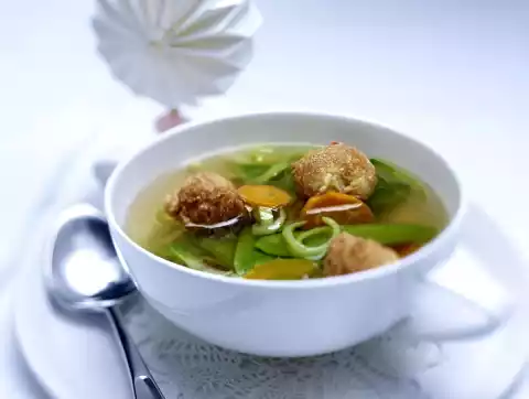 Set aside the leek and the rest of the carrot and cut into thin rings or slices. Wash and clean the mangetouts. Pour stock through a sieve into a pot and bring to the boil. Cook the leek, carrot and sugar snap peas for about 5 minutes.