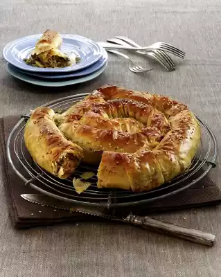 Melt 125 g butter. Moisten 2 tea towels and lay them next to each other with a slight overlap. Place 2 more dry dish towels on top of each other. Place 3 strudel dough sheets on the dish towels, slightly overlapping, and brush with butter. Place another 2 times 3 more strudel sheets on top of each other and brush with butter. Place the last sheet in the middle. Sprinkle with ground hazelnuts. Place the mushrooms as a skein on one long side, leaving a 3 cm wide edge free at the bottom. Turn over the sides, carefully roll up from the long side using the cloths. Brush the roll with butter, form it into a snail and place it on a baking tray lined with baking paper. Sprinkle with sesame seeds and bake in a preheated oven (electric range: 200 °C/ convection oven: 175 °C/ gas: level 3) for 35-40 minutes