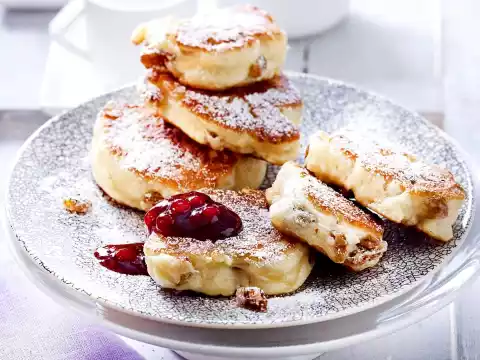Heat the clarified butter in portions in a large pan. Using 2 tablespoons, add approx. 5 small heaps (approx. 1 heaped tbsp. each) to the pan and flatten them a bit at the same time. Fry over a low to medium heat for 4-5 minutes, turning. Place the finished strudel on a plate and keep warm. Bake about 25 more cakes from the remaining dough. Dust thickly with icing sugar for serving. Thickened cranberries or jam can be served with it.