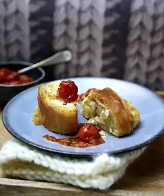 Cut up the finished strudel and arrange on plates with tomato sauce