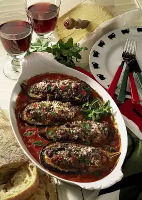Clean and wash the aubergines and cut them in half lengthwise. Remove 2/3 of the flesh and chop finely. Peel and finely chop the onion and garlic. Wash, clean and dice the tomatoes.
