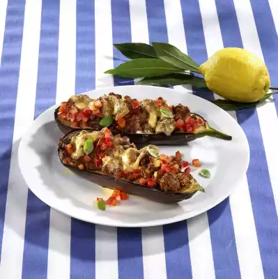 Wash, dry and quarter the tomatoes. Cut out the seeds. Finely dice the flesh. Peel and finely dice onion and garlic. Wash aubergines, dab dry and cut in half lengthwise.