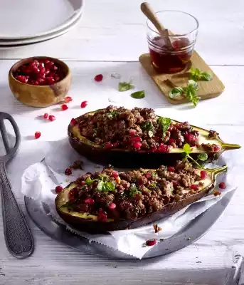 Halve the pomegranate and remove the seeds from both halves. Wash mint, shake dry and chop finely except for something to garnish. Mix the pomegranate seeds and mint into the mince, remove the aubergines from the oven and fill with the mince mixture.