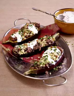 Remove the aubergines from the oven, spread the minced and bulgur in the aubergine halves. Serve, add approx. 1 tbsp. yoghurt and sprinkle with remaining mint. Add the rest of the yoghurt.