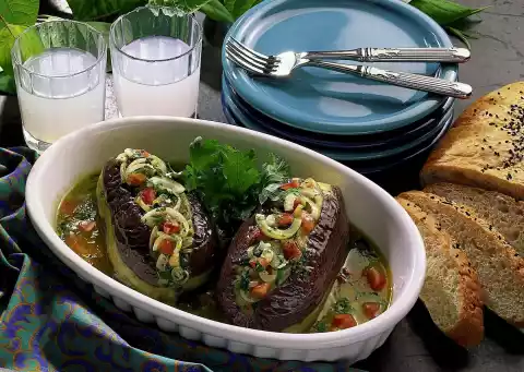 Lightly squeeze out the aubergines, cut lengthwise and add the filling. Put olive oil, sugar and 1/2 litre water in a pot. Place the aubergines in it and weigh them down with a plate. Cover and cook for one hour at low heat.