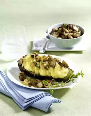 Season to taste with mace, salt and pepper. Fill aubergine halves with puree and arrange on plates with the mushroom pan. Garnish with oregano.