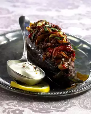 Cut the aubergine deep lengthwise, press them apart a little. Fry all around in 4 tablespoons of hot oil. Fill the mince mixture into the deepenings. Spread the rest of the mixture into a roasting pan.