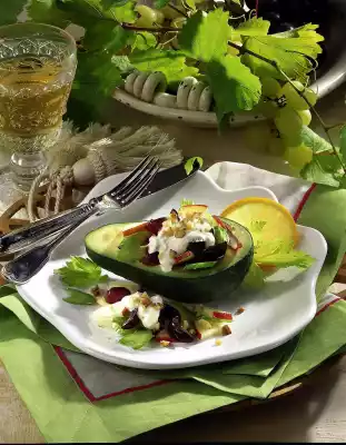 Cut the avocados in half, remove the seeds. Put the salad mix into the fruit halves and onto the plate. Pour sour cream over the filling, sprinkle remaining walnuts over it. Serve garnished with celery leaves and orange slices.