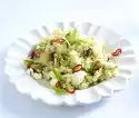 Halve and seed the berries. Wash the apple, dab dry and cut into very fine slices. Chop walnuts. Mix celery, fruit and half of the walnuts. Mix sour cream, lemon juice and sugar.