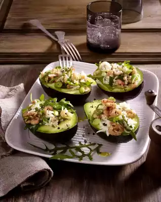 Mix rice, rocket, spring onions and crabs and season with salt. Stir in half the vinaigrette. Halve avocados, remove seeds, season flesh with salt. Fill halves with salad and sprinkle with remaining vinaigrette.