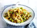 Prepare rice in boiling salted water according to package instructions. Clean and wash spring onions and cut into rings. Sort the rocket, wash, shake dry and chop coarsely. For the vinaigrette, whisk vinegar, salt, pepper, mustard and honey.