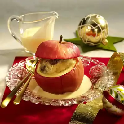 Bake in a preheated oven (electric cooker: 200 °C/ convection oven: 175 °C/ gas: level 3) for approx. 25 minutes. After about 10 minutes, place the "apple lid" on the apple and bake until done. Stir the sauce powder with 6 tablespoons of milk and sugar until smooth. Bring 440 ml milk to the boil and stir in the sauce powder. Bring to the boil again while stirring and serve with the warm apples