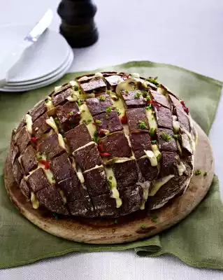 Cut bread crosswise in 1-1,5 cm distance. Place bread on an upside-down, domed saucer and carefully press them apart. Put cheese slices into the incisions. Cover bread with butter in flakes