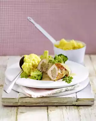 Drain the potatoes, pour on the hot milk and mash them with a potato masher to make puree. Season to taste with salt and nutmeg. Arrange chicken escalopes with sauce, mashed potatoes and broccoli on plates. Garnish with chervil