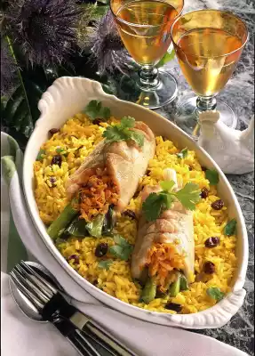 Spread the vegetables over the meat. Roll up firmly. Fix with wooden skewers and wrap them tightly with kitchen string. Place on the rice. Cover with foil and cook at 600 watts for about 12 minutes. Serve garnished with coriander bouquets.