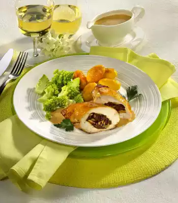 Mix the herbs, tomatoes and pine nuts. Wash the chicken fillets, dab dry and cut a pocket in each one. Fill the pockets with the herb mixture and pin them up with wooden sticks. Season with salt and pepper. Heat oil in a pan and fry chicken fillets on each side for about 3 minutes. Put the chicken fillets with the frying fat on the fat pan of the oven. Pour on chicken stock. Bake in the preheated oven (electric cooker: 200 °C/ convection oven: 175 °C/ gas: level 3) for approx. 30 minutes until golden brown. Meanwhile cook potatoes in boiling water for about 15 minutes. Clean and wash the Romanesco and divide into florets. Steam in little boiling salted water for about 15 minutes. Drain potatoes, rinse and peel. Heat clarified butter in a pan and fry the potatoes for 8-10 minutes, turning them over. 10 minutes before the end of the baking time, brush the fillets with honey.