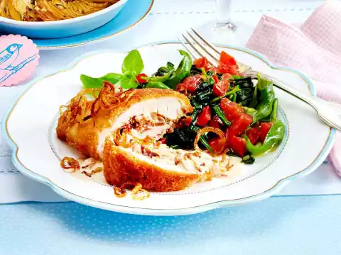 Peel onions, dice 1 onion and put aside for the spinach. Cut remaining onions into fine rings. Heat butter in a pan. Fry the onion rings until golden brown. Stir in honey. Take everything out and let it cool down a bit. Approx. 3⁄4 Mix onions and cream cheese. Season to taste with pepper and a little salt. Wash the fillets, dab dry. Cut a deep pocket into each fillet, fill each with 1 tablespoon of cream. Set the rest of the cream aside.