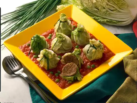 Form balls out of the dough and wrap each ball in a cabbage leaf. Tie up with chives. Heat salt water in a shallow pot. Let the balls simmer for about 15 minutes. Heat the fat for the sauce. Fry the remaining onion cubes. Add peas and chunky tomatoes. Let the sauce boil for 5 minutes. Season to taste with salt, pepper and Tabasco.