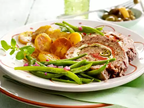 Drain peppers and olives, cut olives into rings. Roughly grate the sheep's cheese. Finely dice onion. Knead mince, egg, breadcrumbs, aiwar and onion, season with salt and pepper.
