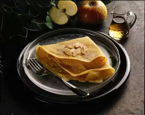 Bake 4 crépes from the dough one after the other, keep warm. Mix apple sauce and Calvados. Fill the crépes with the mixture and fold them up. Roast the almonds in a dry pan. Mix the remaining sugar and cinnamon and sprinkle the almonds over the crépes.