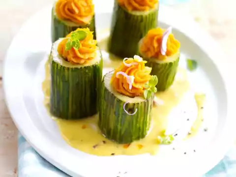 Drain the sweet potatoes, let them evaporate and press them through a potato press. Mix with olive oil and season with salt and pepper. Put the puree into a piping bag and fill the cucumbers with it.