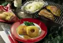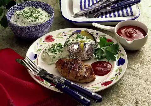 Mix with mustard and chilli powder. Cut pork steaks and fill in the onion-mustard mixture. Cover with wooden sticks. Grill on the hot grill for about 10 minutes, turning occasionally. Arrange potatoes with herb curd cheese and chops on plates. Tastes good with steak sauce
