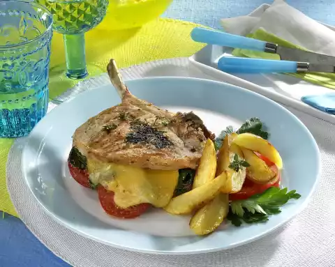 Wash the chops, dab dry and cut a pocket. Season chops from inside with salt and pepper. Clean, wash and slice the tomatoes. Cut the rind off the cheese. Cut cheese slices in half. Wash parsley and pluck off leaves. Put 1 piece of cheese, 2 slices of tomato and some parsley leaves in each meat pocket. Heat the remaining oil. Fry the chops for about 4 minutes on each side. Fry the remaining tomato slices briefly.