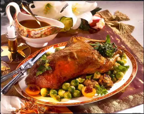 Drain the cabbage and possibly season with nutmeg. Serve with the duck. Garnish with the apricots and marjoram filled with cranberries. Serve with croquettes or boiled potatoes