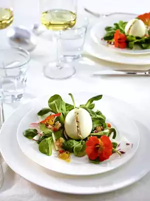 Clean the salad, wash and drain well. Clean, wash and cut radishes into fine sticks. Fill egg cream in a piping bag and fill egg halves with it. Arrange salad with radishes on plates. Place a stuffed egg in the middle of each plate and sprinkle with vinaigrette. Garnish with cress blossoms