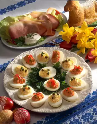 Garnish with capers, tomato slices and herbs. Arrange on a plate with lots of parsley. Mix sour cream, crème fraîche and horseradish. Season with salt and pepper. Drain ham and cut into thin slices. Arrange on a plate with salad leaves and horseradish sauce. Serve with the stuffed eggs