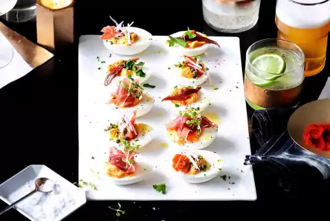 Pick salmon and ham into pieces. Clean and wash the radishes and cut into fine strips. Garnish each 8 egg halves with salmon, radishes, capers and chive rolls, 8 halves with ham and cress and the remaining halves with anchovies, cayenne pepper and parsley. Drizzle with oil as desired.