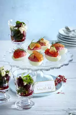 Mix the rocket, beetroot, feta and vinaigrette. Arrange in glasses. Drizzle with nut oil. Cover eggs with caviar, salmon and trout. M