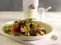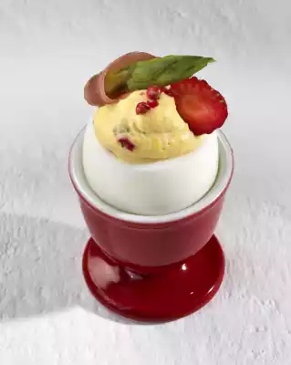 Stir both into the egg cream and season with salt and pepper. Pour into a piping bag with perforated spout and squirt into the eggs. Cut the ham into strips. Garnish eggs with strawberry slices, asparagus, ham and pepper.