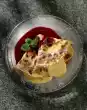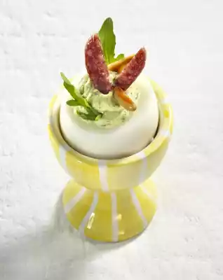 Mix with the pesto cream and season with salt and pepper. Roast the pine nuts in a pan without fat until golden brown. Wash the rocket and dab dry. Cut salami in half lengthwise and cut into thin slices. Pour pesto cream into a piping bag with a perforated spout and squirt into the eggs. Garnish with salami slices, rocket and pine nuts