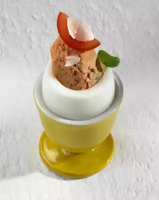 Put the eggs in boiling water and boil hard for about 10 minutes. Drain, rinse with cold water and remove the shell. Let them cool down. Cut a lid off the eggs. Carefully remove the egg yolk with a knife or teaspoon.