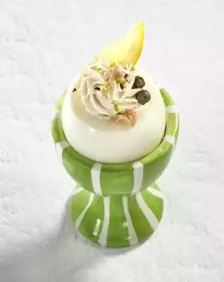 Carefully remove the egg yolks with a knife or teaspoon and pass through a sieve. Puree the egg yolks, shallot, cream cheese, tuna and capers, except some for garnishing, in the universal chopper. Season to taste with lemon juice, salt and pepper. Pour the tuna cream into a piping bag with star-shaped spout and squirt into the eggs. Garnish with tuna, capers and alfalfa sprouts