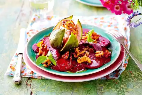 For the figs, wash and clean the fruit, make a deep cross incision at the base of the flower and press them apart slightly. Fill with cream cheese, place on the beetroot and sprinkle with onion-nut mixture. Spread the salad on the carpaccio.