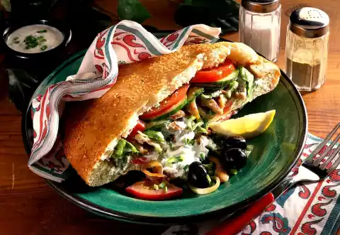 Mix yoghurt, garlic, chives and lemon juice, season with salt and pepper. Cut a deep pocket into each flat bread half. Mix the shredded meat and salad strips. Pour the tomato and cucumber slices, shredded meat and 2/3 of the sauce into the flatbread pockets. Arrange the bread halves on plates. Garnish with lemon wedges and olives and serve with the remaining sauce