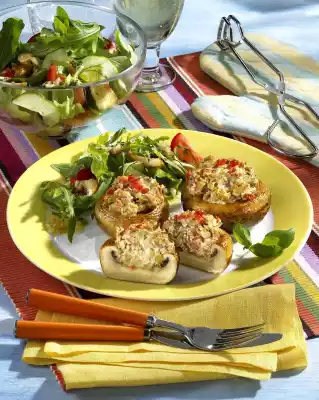 Add oil. Brush the mushrooms with oil from the bottom and sprinkle with salt and pepper. Place the mushrooms with the underside on the preheated grill and brown lightly. Then turn the mushrooms over and fill with the mushroom mixture.